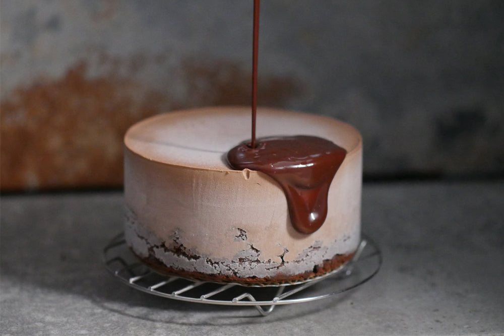 A Finishing Touch: This recipe provides a smooth, glossy finish to amplify your dessert presentation. One of our favorites? Pour a Perla 64% chocolate glaze over a rich Tumaco 65% chocolate mousse cake. Picture mousse cake create via an anglaise method.