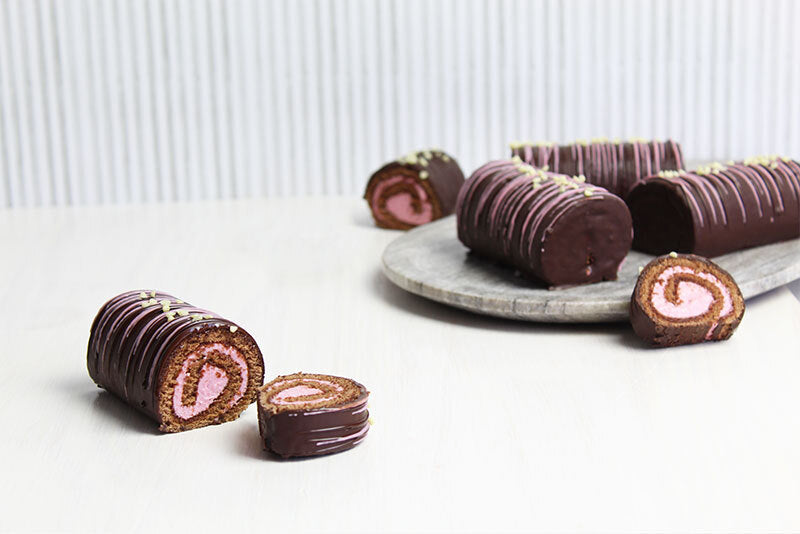 Elevate classic favorites with our Dreidoppel Flavor Pastes, like these Hibiscus Ho-Hos! Creamy hibiscus filling wrapped inside of a hibiscus syrup soaked cocoa sponge cake topped with more chocolate makes this sweet treat totally irresistible.