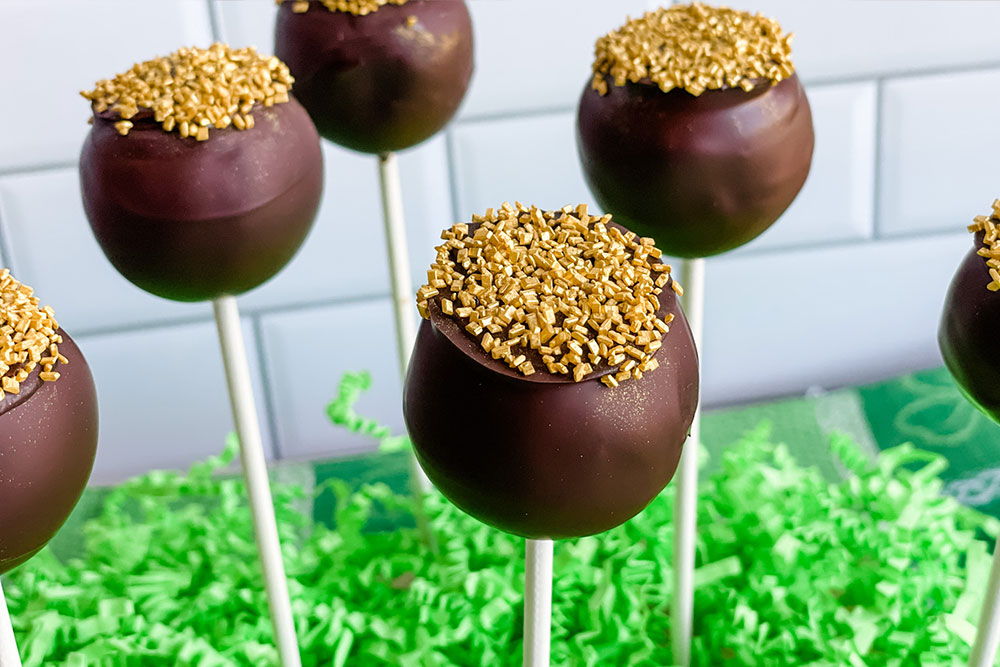 We've struck gold with these St. Patrick's Day Pot of Gold Brownie Pops! Chocolatey, no-bake brownie dough is dipped in luscious dark chocolate, then topped with sparkly Gold Crystal Sugar to look like shimmering pots of gold. Leprechaun approved!