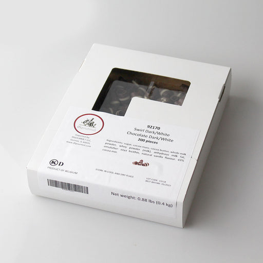 ifigourmetA dark chocolate curl with a stripe of white chocolate made with Belgian chocolate. A perfect little topper for cupcakes, eclairs, tarts, cakes and...